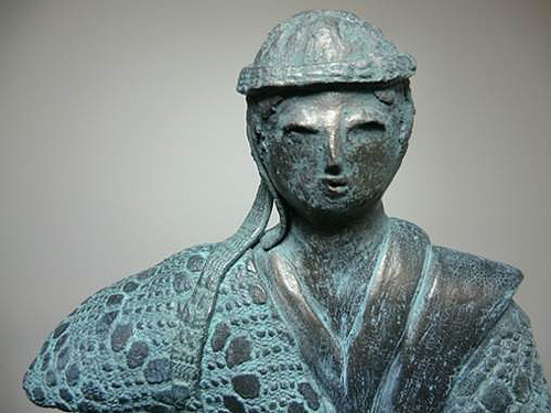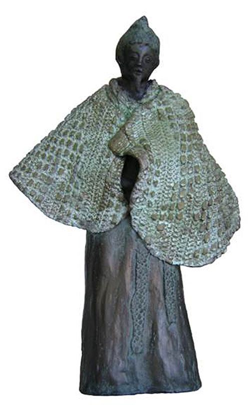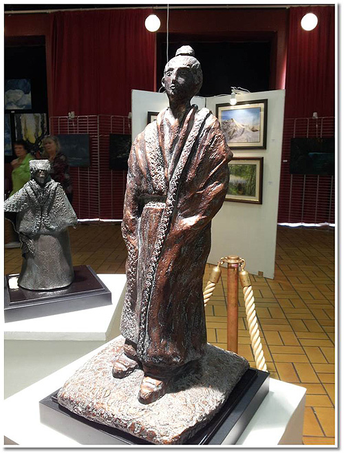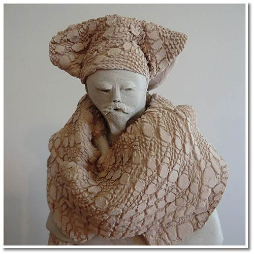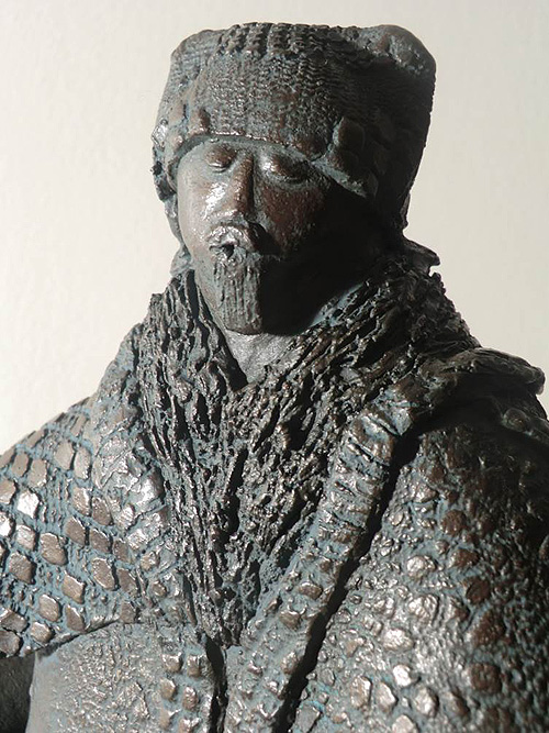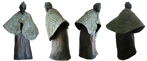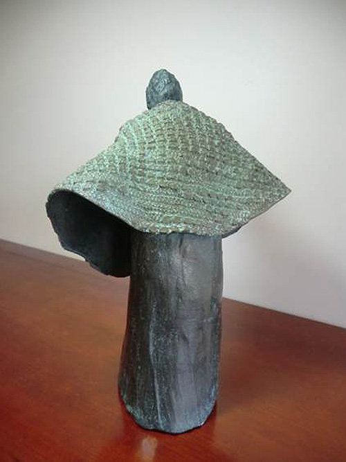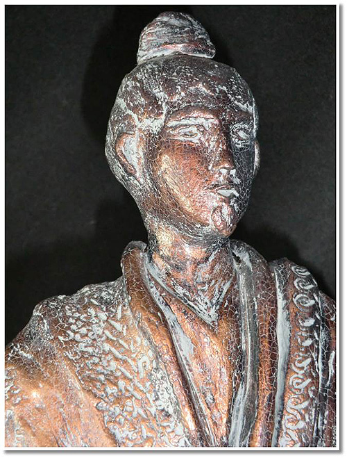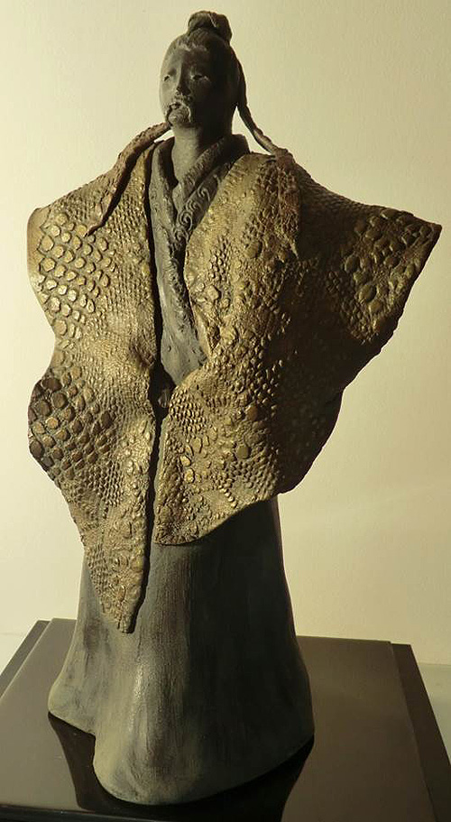 Si je devais parler de mes sculptures voici ce que je peux te dire : J'aime à penser que mes sculptures sont nées de mon amour pour l'Orient.. mon esprit parcourant la Chine,le Japon... remontant le temps. Mes doigts se sont mis à modeler dans le silence de la nuit tous ces êtres sortis de mon imaginaire, de mes lectures... Mettre un visage sur un nom, sur un Seigneur se préparant au combat. Honorer le Maître, le Conseiller perfectionnant la calligraphie, l'art de la poésie, s'émerveillant malgré son air bourru devant les peintures du Maître Seisshu... ou encore Niamé, la servante préparant avec grâce et rigueur la cérémonie du thé comme l'enseigna le grand lettré San Rikyù... Matsuda, Ichiro, Iraé... elles ont toutes une âme... Leurs yeux mi-clos, leur dos voûté, leur démarche lente exprimant sérénité et compassion. |