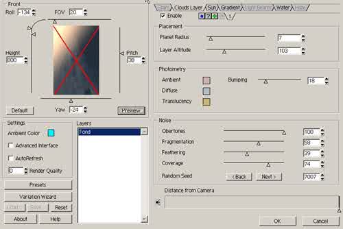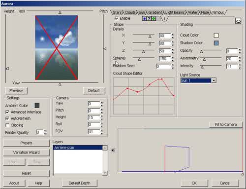 Aurora 1.0 : plug'in de réation de nature 3D; ciel, nuages, eau, soleil, lune, étoiles, brume, et lumière. Ci-dessous la démo. |