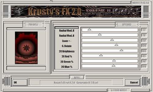 Krusty's FX vol. II 1.1 : Pour système d'exploitation Windows. Krusty's FX 2.0 beta : un générateur de texture avec 27 filtres, compatible avec Paint Shop Pro, Painter et PhotoPaint. Pour système d'exploitation Windows. |