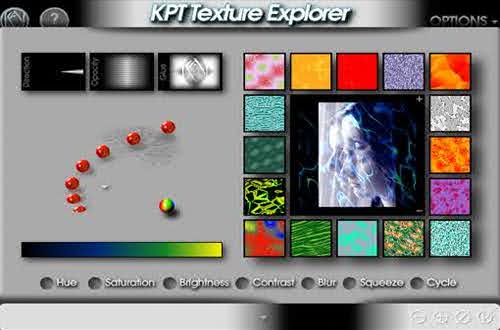Kai's Power Tools 3 : Un ensemble de 18 effets dont Gradient Designer, Interform, Spheroid Designer, Texture Explorer, 3D Stereo Noise, Glass Lens, Page Curl, Planar Tiling, Seamless Welder, Twirl, Video Feedback, Votex Tiling, Edge F/X, Intensity F/X, Metatoys F/X, Noise F/X, Pixel F/X et Smudge F/X. Le tout compatible avec Paint Shop Pro, PhotoPaint, Painter, FireWorks. Pour système d'exploitation Mac & Windows. Ci-dessous la démo de Texture Explorer. |