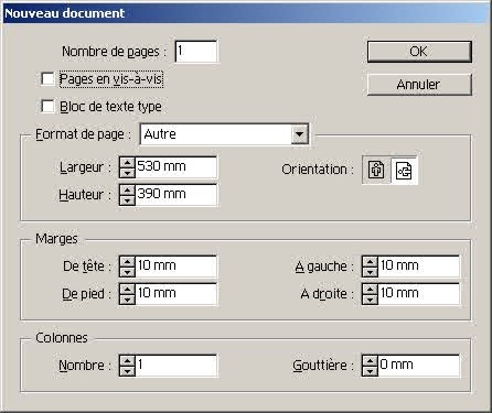 dans la fenêtre ainsi ouverte, à Format de page, mettez Autre, Orientation paysage, puis en Largeur 530mm, et en Hauteur 390mm... passez à la section Marges, mettez 10mm en tête, 10mm en pied, 10mm dans le petit fond et 10mm dans le grand fond, comme sur la figure ci-dessous... |