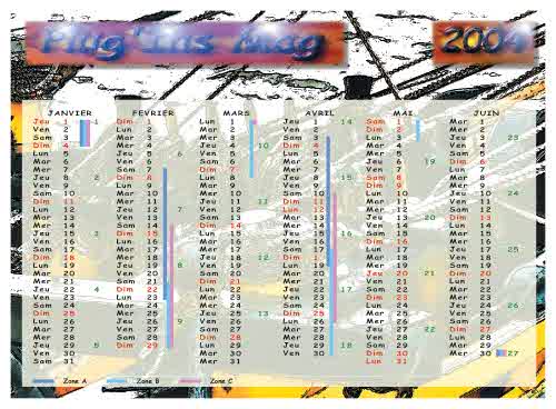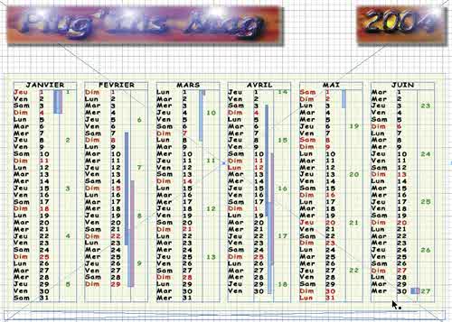 Cliquez sur « Enregistrer...», puis cliquez sur l'icône de réduction de la fenêtre Calendrier 2004 verso. Maintenant cliquez sur l'icône d'agrandissement de la fenêtre Calendrier 2004 recto. Etape 20 : et oui, vous avez compris, maintenant il vous faut faire la même chose sur le recto. Je vous donne les dates des vacances, mais faites attention car certaines zones ont des dates différentes. Noël du samedi 20/12/03 au lundi 05/01/04, ceci pour les 3 zones. Hiver zone A du samedi 07/02/04 au lundi 23/02/04, zone B du samedi 21/02/04 au lundi 08/03/04, zone C du samedi 14/02/04 au lundi 01/03/04. Printemps zone A du samedi 03/04/04 au lundi 19/04/04, zone B du samedi 17/04/04 au lundi 03/05/04, zone C du samedi 10/04/04 au lundi 26/04/04. Début des vacances d'été pour les 3 zones, le mercredi 30/06/04. Et si vous avez bien travaillé vous devriez avoir la figure ci-dessous. |