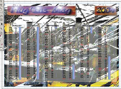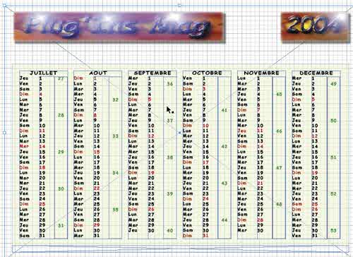 Cliquez sur « Enregistrer...». Maintenant sélectionnez successivement les 6 rectangles que vous venez de faire en maintenant la touche shift enfoncée et dans le menu déroulant « Edition », cliquez sur « Copier », puis cliquez sur l'icône de réduction de la fenêtre Calendrier 2004 recto. Cliquez sur l'icône d'agrandissement de la fenêtre Calendrier 2004 verso, sélectionnez la boite 490X10mm, dans le bas du document et dans le menu déroulant « Edition », cliquez sur « Coller sur place », vérifiez que c'est bien collé à la même place que dans le Calendrier 2004 recto, puis cliquez sur « Enregistrer...». Etape 22 : Il ne vous reste plus qu'à importer la photos du fond et puis modifier certains réglages si besoin est. Sélectionnez la première boite, celle de 510X370mm, dans le menu déroulant « Fichier », cliquez sur « Importer...» dans la boite de dialogue sélectionnez votre image puis cliquez sur ok, puis cliquez sur le bouton droit de la souris pour avoir le menu contextuel, puis cliquez sur « Ajustement > Ajuster le contenu au bloc », vous devriez avoir la figure ci-dessous. |