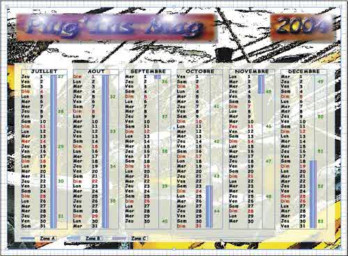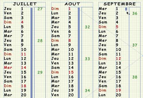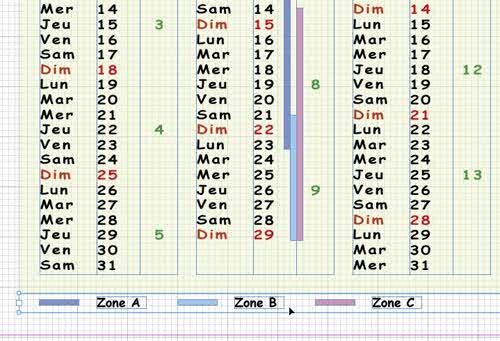 Etape 18 : Passez maintenant à la zone B en changeant la couleur... sélectionnez le petit rectangle de 3mm de large sur une longueur de 233mm de juillet, puis dans le menu déroulant « Edition », cliquez sur « Copier » et collez-le en le décalant à droite du 1er juillet, changez la couleur... dans la palette, cliquez sur l'onglet de la couleur, puis mettez les valeurs suivantes : C 50%, M 4%, J 0%, N 0%. Faites la même chose pour août, cliquez sur « Copier », puis collez-le en le décalant à droite du 1er août et faites encore la même chose pour le petit bout de septembre. Faites la même chose pour les vacances de la Toussaint, puis pour les vacances de Noël et vous devriez avoir la figure ci-dessous. |