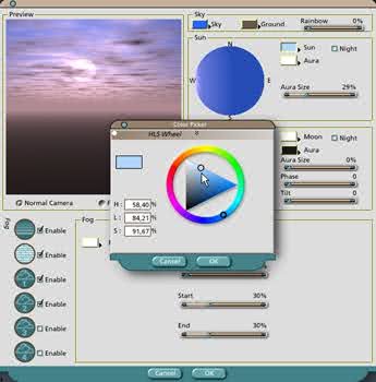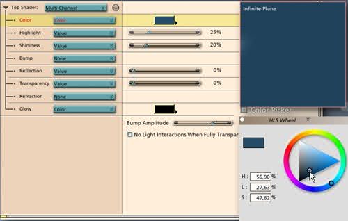dans la barre de menu, cliquez sur Windows, Texture ou faites Ctrl+4. Dans le séquenceur de texture, cliquez sur Color, cliquez sur l'icône de couleur et dans la palette chromatique mettez les valeurs de Bleu : (H 56,90 L 27,63 et S 47,62), comme sur la figure ci-dessous. |