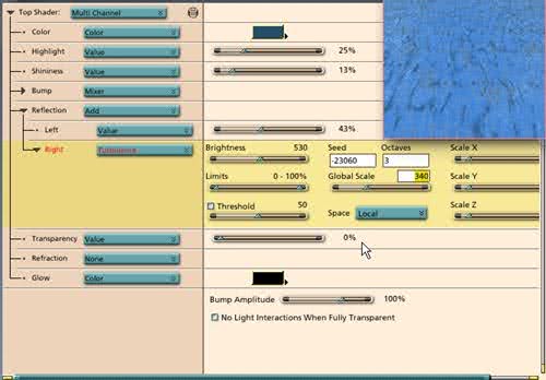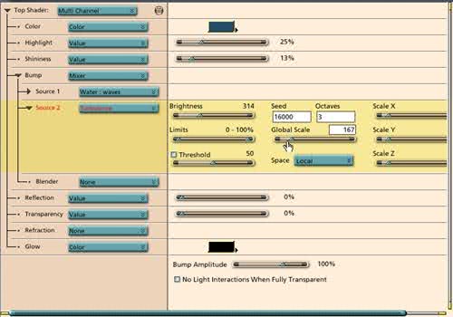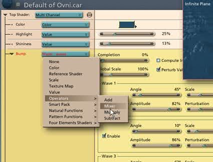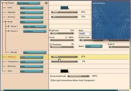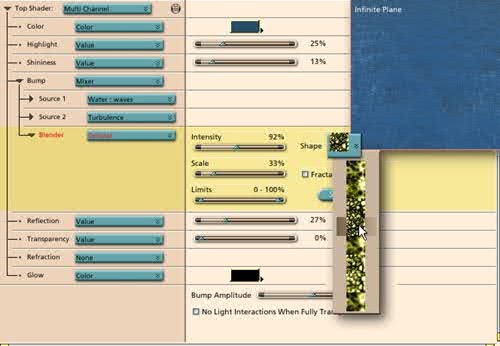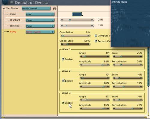 cliquez sur Shininess et mettez la valeur à 13%, puis cliquez sur Bump, cliquez sur Four Elements Shaders, Water Waves, Cochez Wave 1, Wave 2 et Wave 3, puis mettez les paramètres de valeurs comme suit : pour Wave 1 (Angle 45°, Amplitude 82%, Scale 25% et Pertubation 24%), pour Wave 2 (Angle 10°, Amplitude 86%, Scale 16% et Pertubation 33%) et pour Wave 3 (Angle 67°, Amplitude 85%, Scale 16% et Pertubation 71%), comme sur la figure ci-dessous. |