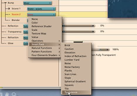 Vous remarquez que Dump contient deux sources maintenant, qui prennent en compte dans la source 1, les paramètres de valeurs que l'on vient de mettre, et dans la source 2, les paramètres de valeurs que vous allez installer maintenant, donc cliquez sur source 2 pour ouvrir le menu déroulant, cliquez sur Smart Pack, Turbulence, comme sur la figure ci-dessous. |