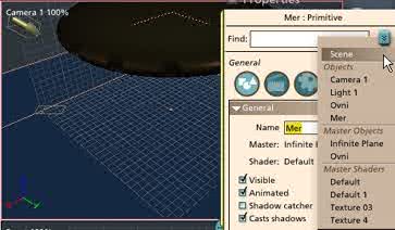 Cliquez sur la salle d'assemblage, tirez la poignée de droite pour ouvrir le « tiroir Propriétés » et cliquez sur l'icône General et nommez le plan infini du nom de Mer, puis cliquez sur le bouton de liste et mettez Scene, comme sur la figure ci-dessous. |