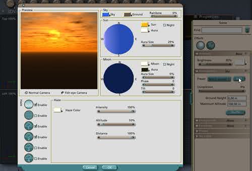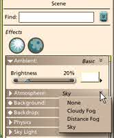 Etape 10 : Cliquez sur l'icône Effects, cliquez sur le menu déroulant d'Atmosphere et mettez Sky, comme sur la figure ci-dessous. |