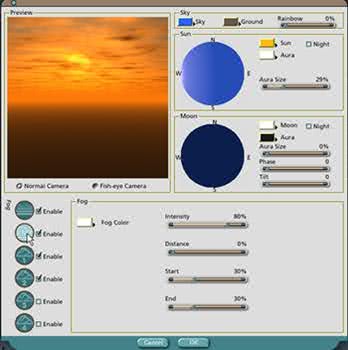 Vous allez ajouter du brouillard à cette petite scène... cliquez sur l'icône Fog, et mettez les paramètres de valeurs comme suit : Intensity 80%, Distance 0%, Start 30% et End 30%, comme sur la figure ci-dessous. |