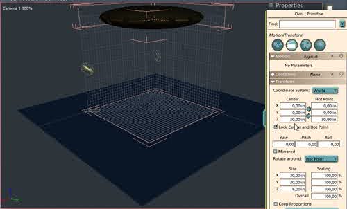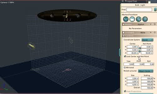 Etape 11 : Dans la barre de menu, cliquez sur Insert, Buld, et tirez la poignée de droite pour ouvrir le « tiroir Propriétés », cliquez sur l'icône « Motion/Transform », réglez les paramètres comme suit : dans le menu Transform, à « Center » les coordonnées XYZ (X 0), (Y 0), (Z 30), pour « Hot Point » idem, puis « Yaw » à (0), « Pitch » à (0), « Roll » à (0), et pour «Size» (X 2), (Y 2), (Z 4), comme sur la figure ci-dessous. |