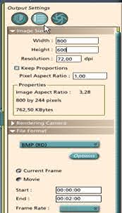Maintenant cliquez sur l'icône Output Settings, puis sur Image Size, mettez les paramètres Width 800 et Height à 600, et dans File Format cliquez sur Current Frame, comme sur la figure ci-dessous. |