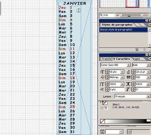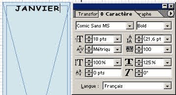 sur la première ligne, à l'intérieur de ce rectangle, tapez « JANVIER », puis dans la palette, cliquez sur l'onglet Caractère et mettez les paramètres comme suit... caractère : Comic Sans MS, 18pts, Bold, AV : 100, T:100%, T:125%, puis centrez, voir les figures ci-dessous. |