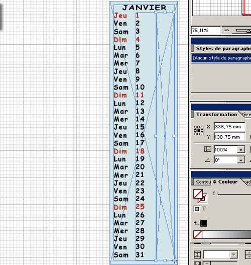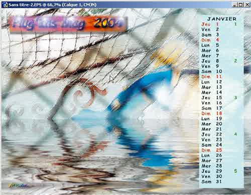 Maintenant vous pouvez admirer votre oeuvre, puis la sauvegarder sous le nom de janvier... mais avec InDesign 2.0 vous pouvez également l'exporter aux formats suivants : PDF, SVG, HTML, XML et EPS(puis le transformer en BMP, JPEG et bien d'autres dans photoshop), et tout cela sans plug'ins évidemment. |