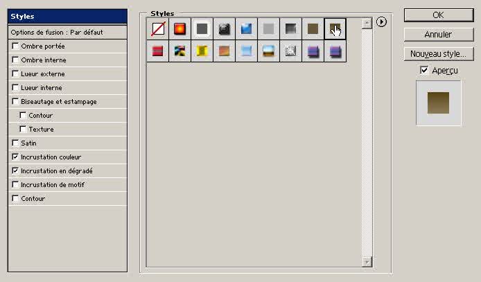 Etape 3 : Dans le menu Calque, cliquez sur Style de calque, Options de fusion (c'est là le coeur du problème avec lequel vous devez vous familiariser évidemment). Dans la fenêtre Style de calque, cliquez sur Styles, puis comme sur la figure ci-dessous sur l'icône de photo du passé. Evidemment j'utilise là un Style natif pour que tout le monde puisse faire ce tutorial, mais vous pouvez très bien en créer de nouveaux (de l'imagination que diable !). |