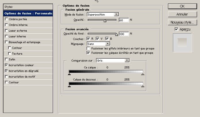 Etape 4 : On retourne dans le menu Calque, cliquez encore sur Style de calque, Options de fusion et cochez les cases Incrustation couleur et Incrustation en dégradé, puis mettez le Mode de Fusion sur Superposition et l'Opacité à 60 %. Comme sur la figure ci-dessous. |