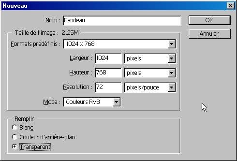 Etape 2 : Je vais créer deux nouveaux fichiers au même format, un en fond blanc du nom de Fond (menu Fichier, cliquez sur Nouveau, puis remplir en Blanc) et l'autre en transparent du nom de Bandeau (menu Fichier, cliquez sur Nouveau, puis remplir en Transparent). Voir figure ci-dessous. |