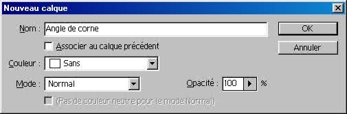 Etape 5 : Revenez au fond transparent, puis créez un calque du nom d'Angle de Corne (dans le menu Calque, cliquez sur Nouveau, Claque), |