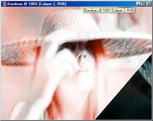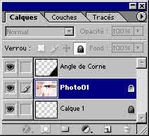 Etape 9 : Revenez au fichier Bandeau, cliquez sur le calque Angle de Corne, puis copiez dans l'angle de corne (dans la menu édition, cliquez sur Coller dedans). Voir la figure ci-dessous. |