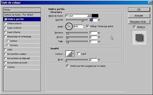 Toujours sur le calque Photo01, vous pouvez maintenant placer une ombre (dans le menu Calque, cliquez sur Style de Calque, Ombre Portée), et réglez les paramètres comme sur le figure ci-dessous. |