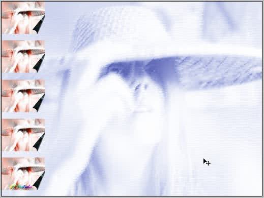 Maintenant que votre Corne est faite, si comme moi vous souhaitez en faire un bandeau gauche pour un papier à lettres, il vous faut réduire l'image à une vignette d'environ 6cm x 4, 52cm puis en coller 5 sur notre fond blanc sur lequel vous avez collé une photo en un bleu très léger, voir Etape 4. Vous pouvez suivre pour faire le tutorial, Créez votre papier à lettre. Ce qui vous donnera à peu près la figure ci-dessous. |