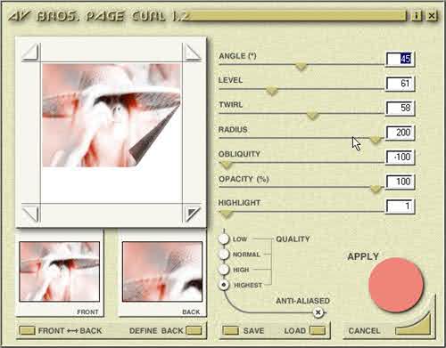 Le but de ce tutorial est de maîtriser un effet de corne comme on pourrait le faire aisément avec un des plug'ins réservés à cet effet, comme le célèbre pagecurl de la société AV Bros Software. On va se servir de cet effet de corne que l'on va appliquer à une vignette qui servira de bandeau gauche pour faire un nouveau papier à lettre. Ci-dessous une corne avec le Plug'in PageCurl. |