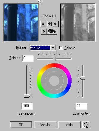 Etape 2 : Dans le menu Couleurs, cliquez sur Ajuster, Teinte/Saturation/Luminosité, Comme dans la figure ci-dessous, mettez la Saturation à - 100 et la Luminosité à 25. |