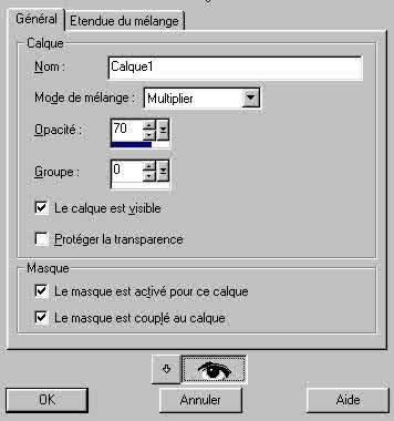 Etape 9 : Evidemment il faut l'additionner à l'image précédente. Dans le menu Calques, cliquez sur Propriétés... et réglez le mode de mélange sur Multiplier et l'Opacité sur 70, comme sur la figure ci-dessus. |