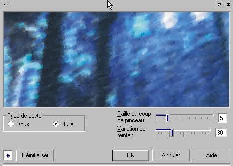 Etape 4 : Maintenant nous allons sélectionner et copier. Dans le menu Masque, cliquez sur Tout sélectionner et dans le menu Edition cliquez sur Copier. Etape 5 : Puis vous allez revenir en arrière jusqu'à votre image initiale. Dans le menu Edition, cliquez sur Annuler l'opération Sélection de tout le masque, cliquez encore sur Annuler l'opération Recherche des bords et cliquez enfin sur Annuler l'opération Teinte/Saturation/Luminance, ce qui vous fait cliquer 3 fois en tout. Etape 6 : Dans le menu Effets, cliquez sur Coups de pinceau artistiques, Pastels et réglez les paramètres en mettant le Type de Pastel sur Huile comme sur la figure ci-dessous. |