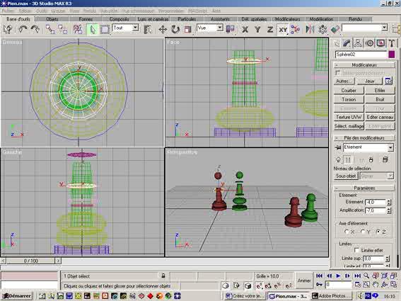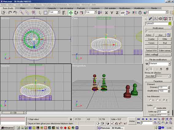 Etape 4 : Sélectionnez la Sphère01, puis dans modificateurs, modifiez les Paramètres d'Amplification qui sont à -15,0, mettez -10,0. Sélectionnez l'objet pour déplacer l'ellipse presque en haut de votre cylindre01. En fait, après avoir modifié, on remet les objets composant le Pion01 en place. Comme sur la figure ci-dessous. |