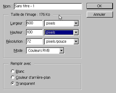 Etape 1: Dans le menu Fichier créez un nouveau document, puis mettez la largeur à 600 pixels, la hauteur à 100 pixels, la résolution à 72 et remplissez avec Transparent voir ci-dessous. |