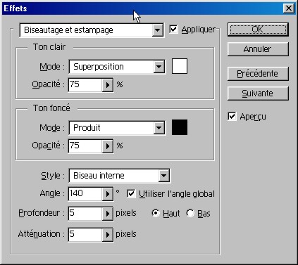 Etape 5: Fusionnez les calques. Puis dans le menu Calque cliquez sur effets Biseautage et estampage, mettez angle à 140° comme figure ci-dessous.