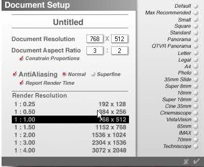 Etape 1 : Ouvrez « BRYCE 5 » et dans la barre de menu, cliquez sur File, New Document et réglez les paramètres comme sur la figure ci-dessous. |