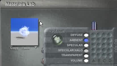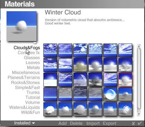 puis cliquez sur « Clouds&Fogs » (où se trouve le pointeur sur la figure ci-dessous), et sur la matière « Winter Cloud » (où se trouve l'encadré rouge sur la figure ci-dessous). |