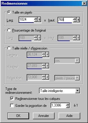 Etape 2 : Allez dans le menu image, cliquez sur redimensionné et mettez la largeur à 1024 pixel et la hauteur à 768, et la résolution à 72 ppp, comme sur la figure ci-dessous. |