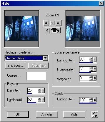 Etape 3 : Comme cette photo est brute et que je veux en faire une oeuvre, alors je vais la travailler. Je vais commencer par lui appliquer un halo, dans le menu Effets, cliquez sur Effets de lumière / Halo, et réglez les paramètres comme sur la figure ci-dessous. |