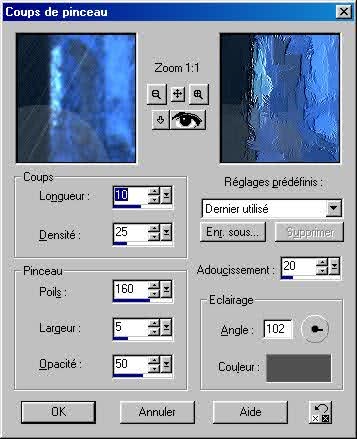 Etape 4 : Maintenant je vais commencer à vraiment transformer ma photo. Dans le menu Effets, cliquez sur Effets artistiques / Coups de pinceau, et réglez les paramètres comme sur la figure ci-dessous. |