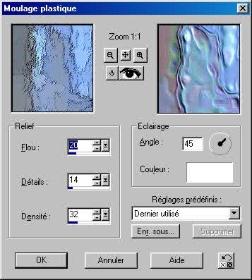 Etape 6 : Comme cette image ne me satisfait pas encore... et oui je suis comme ça, jamais content... je vais lui appliquer encore un petit effet... donc vous retournez dans le menu Effets, cliquez cette fois sur Effets de Texture / Moulage pastique, et réglez les paramètres comme sur la figure ci-dessous. |