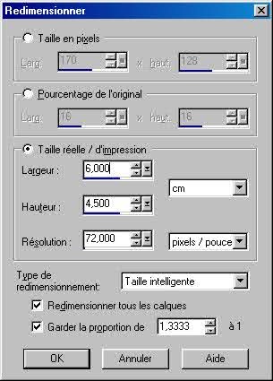 Etape 8 : Sauvegardez l'image ainsi obtenue au format 1024 x 768 comme fond du papier. Maintenant nous allons revenir en arrière jusqu'à « Effets artistiques » « Coup de pinceau ». Dans le menu Edition, cliquez sur Annuler Ajuster les paramètres de Luminosité / Contraste, puis cliquez encore sur Annuler Moulage pastique, puis enfin sur Annuler Crayon de couleur, et vous retrouvez ainsi l'image du Coups de pinceau, que l'on va réduire. Etape 9 : Dans le menu image, cliquez sur redimensionné... et mettez maintenant la largeur à 6 centimètres et la hauteur à 4,5 centimètres, comme sur la figure ci-dessous. |