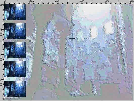 Etape 10 : Dans le menu Sélections, cliquez sur Sélectionner tout, puis dans le menu édition, cliquez sur copier. Maintenant que vous n'avez plus besoin de la vignette de 6 centimètres, vous pouvez la sauvegarder pour plus de sécurité, puis rechargez votre fond de faible intensité. Comme actuellement vous avez en mémoire dans votre presse-papiers la vignette de 6 centimètres, dans le menu édition, cliquez sur coller, comme Nouveau Calque, puis positionnez-le avec l'outil Déplacement, dans le coin supérieur gauche de votre fond de faible intensité au format 1024 x 768 pixel, collez en tout 5 petites vignettes à la suite dans le coin gauche, puis dans le menu Calques, cliquez sur Fusionner, Fusionner tout, comme sur la figure ci-dessous. |