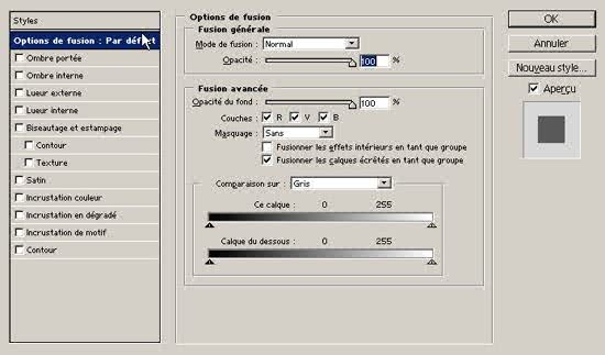 Etape 3 : Puis j'ouvre la boîte de dialogue Style de calque (dans le menu Calque, cliquez sur Style de calque, options de fusion), voir figure ci-dessous. |