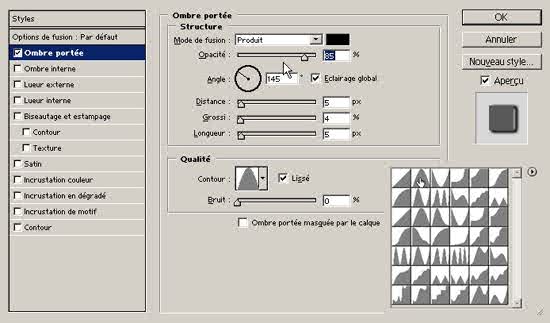 Etape 4 : A gauche, dans la colonne des styles, cliquez sur Ombre portée, puis sur Aperçu, mettez le mode de fusion sur Produit, l'Opacité sur 85, l'Angle sur 145°, la Distance à 5 pixels, le Grossi à 4%, la Longueur sur 5 pixels et le Contour sur Cône. voir figure ci-dessous. |