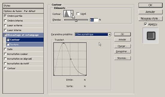 Etape 5 : Revenez dans la colonne des styles, cliquez maintenant sur Biseautage et Estampe, puis sur Contour, mettez les paramètres prédéfinis sur Cône asymétrique et l'étendue à 50%. voir figure ci-dessous. |