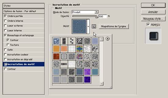 Etape 6 : Toujours dans la colonne des styles, cliquez sur Incrustation de motif, cliquez encore sur la boîte de motifs, sélectionnez la Toile. voir figure ci-dessous. |
