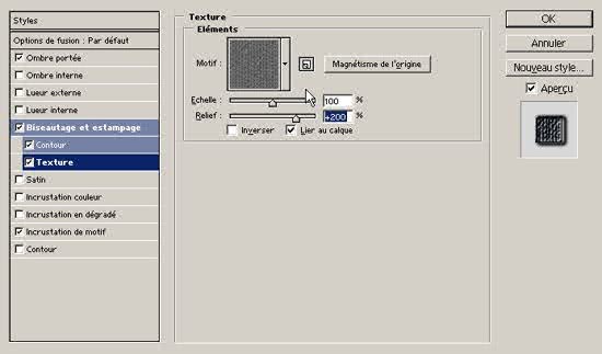 Etape 7 : Maintenant revenez encore dans la colonne des styles, cliquez Texture, remettez sur toile, mettez l'Echelle à 100% et le Relief à 200%. voir figure ci-dessous. |