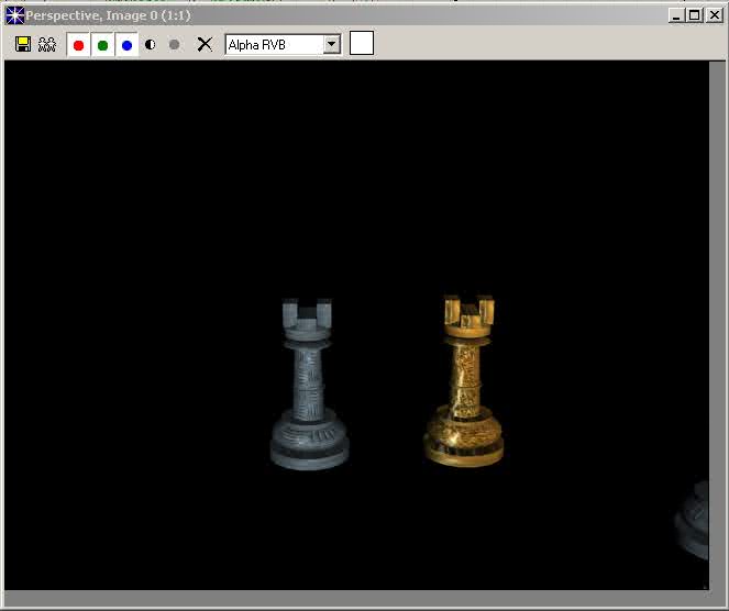Etape 5 : Sélectionnez les objets en les entourant, puis dans le menu Groupe, cliquez sur groupe, puis nommez-le « Tour ». Dans le menu Edition cliquez sur Copier et vous nommerez le nouvel objet « TourOr01 », puis cliquez encore une fois sur Copier et nommez « TourArgent01 ». Il ne vous reste plus qu'à mettre les textures Bitmap GOLDFOIL et MtlPlat2 sur « TourOr01 » et « TourArgent01 ». Faites un rendu pour vérifier votre travail, puis sauvegardez et passez à la Troisième partie de ce Tutorial. |