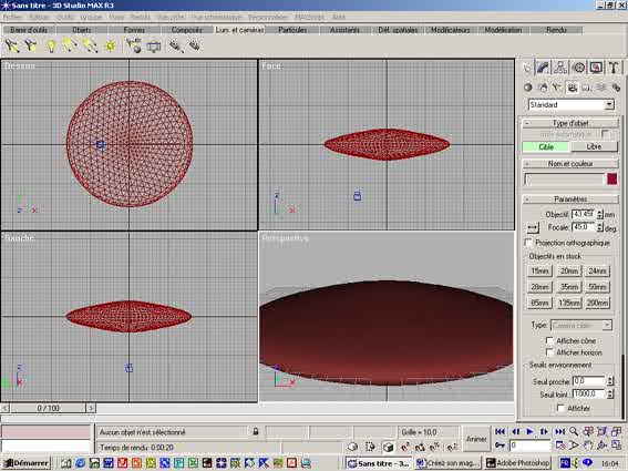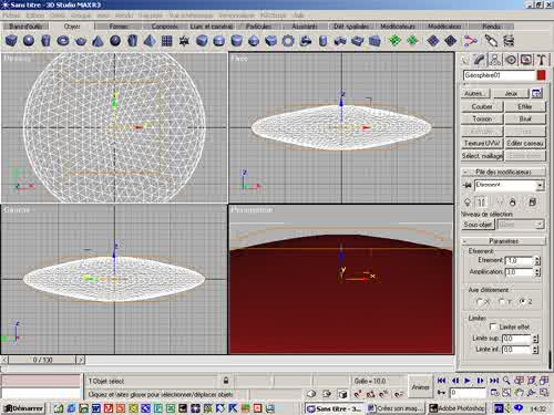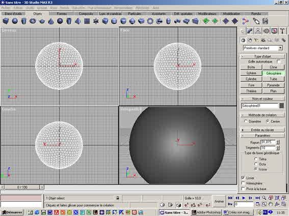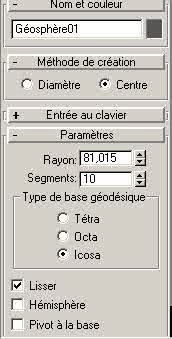 Etape 1 : Dans le menu Fichier cliquez sur nouveau, puis dans l'onglet Objets, cliquez sur Géosphère, puis changez les Paramètres, moi j'ai mis le Rayon à 81,015 et les Segments à 10, comme ci-dessous. |