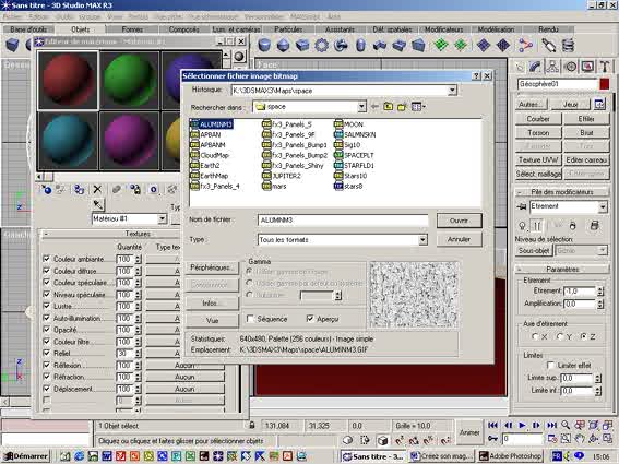 Etape 3 : Donnez une texture à votre objet, moi j'ai choisi de l'aluminium. Donc dans le menu Outils, puis Editeur de matériaux, cliquez sur Textures, puis choisir sa texture, moi j'ai choisi l'aluminium que j'avais en réserve bien au chaud dans un tiroir. Voir figure ci-dessous. |
