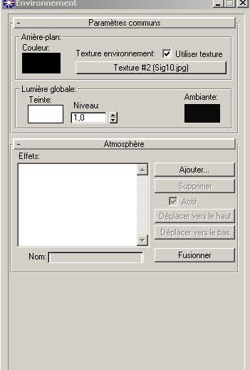 Etape 4 : Insérez maintenant son environnement, une galaxie comme moi par exemple. Dans le menu Rendu cliquez sur Environnement, cochez Utiliser texture puis chargez la texture. Voir figure ci-dessous. |