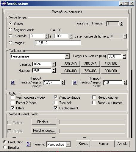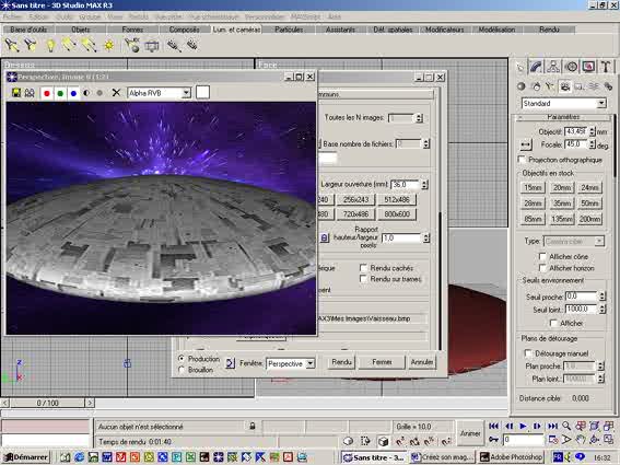 Un rendu pour voir, dans le menu Rendu, cliquez sur Rendu, puis dans la Taille de sortie mettez la Largeur à 1024 et la Hauteur à 768 pour avoir une image plein pot, puis dans sortie du rendu vers, cliquez sur fichiers pour indiquer un endroit ou sauvegarder l'image. Maintenant il n'y a plus qu'a cliquer Rendu. Voir figure ci-dessous. |